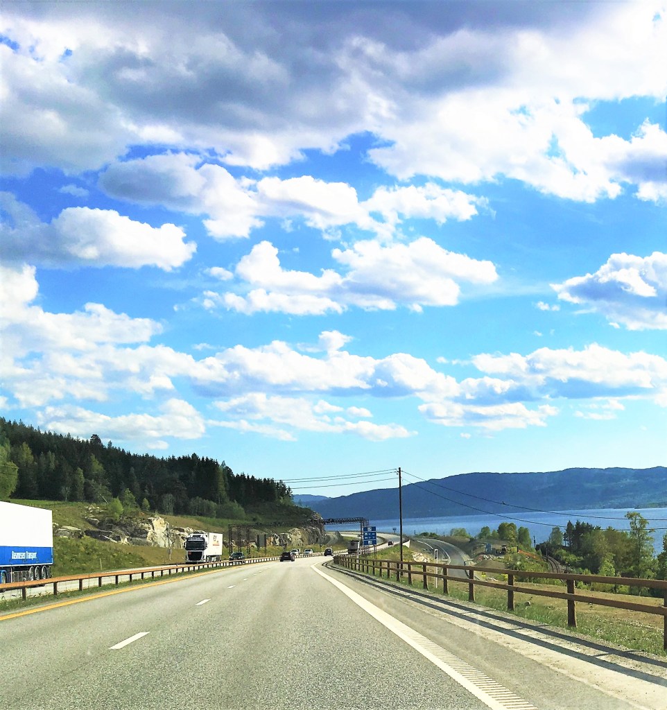 On peut remonter sur des centaines de kilomètres avec ce genre de vue, on en a jamais assez. Le seul inconvénient, la route est coincée entre les montagnes ( majestueuses) et la mer, il n’est pas possible de faire de pause. Les arrêts « petit coin » ne sont pas possibles pendant plusieurs heures. Et ce n’est pas anodin quand on relie Oslo à Trondheim, par exemple ( 6h de trajets).